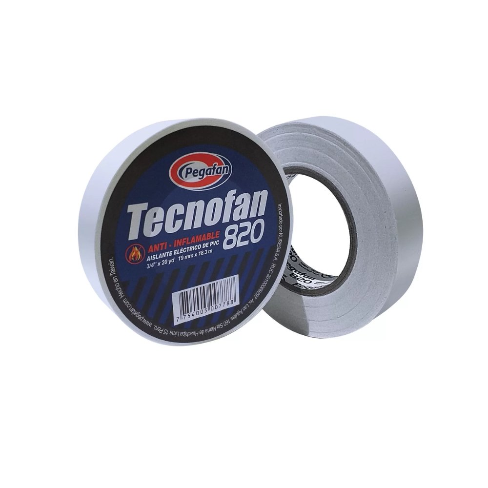 Cinta aislante Tecnofan 820 antiinflamable 3/4 x 20 yardas color blanco de Pegafan.