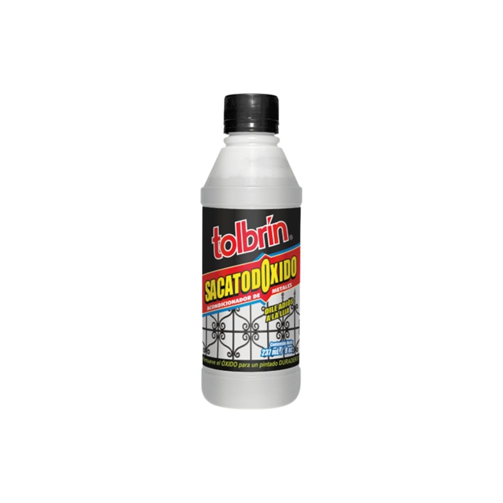 El saca óxido Tolbrin, botella de 8 onzas (237 ml), sirve para llevar a cabo trabajos de mantenimiento y limpieza en piezas metálicas para detener el proceso de corrosión sin la necesidad de lijar en exceso. Su fórmula permite reparar superficies en mal estado y alargar su durabilidad.