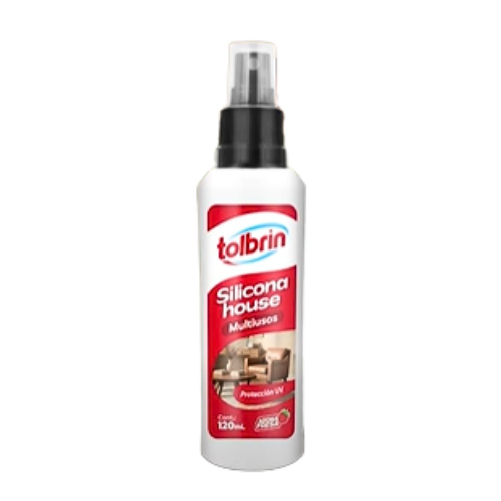 La silicona multiusos Tolbrin, presentación de 120 ml con aroma a fresa, sirve para relucir superficies como plásticos, cuero, partes de autos, vinil, entre otros, para detener el malgaste prolongado. Además, protege frente a los rayos UV.